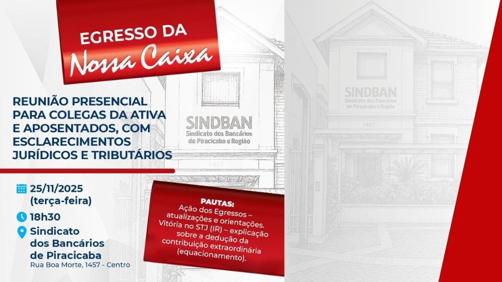 Os bancários egressos da antiga Nossa Caixa terão a oportunidade de sanar dúvidas jurídicas e tributárias em uma reunião presencial marcada para o dia 25 de novembro de 2025, terça-feira, às 18h30, no Sindicato dos Bancários de Piracicaba e região. O encontro é voltado a colegas da ativa e aposentados que integraram o quadro da instituição.